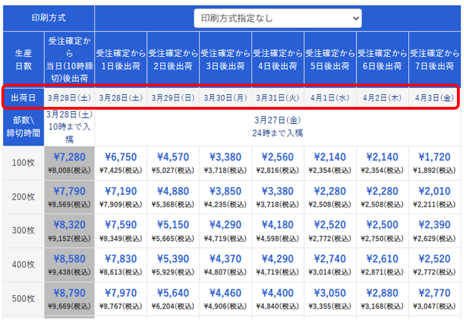 出荷日は料金表の上部に記載しております。主に東京からの出荷となるため、納品先によって納品日は異なります。納品日については、こちらよりご確認ください。※23:59までに、不備のないデータをご入稿いただいた場合の出荷日となります※PDF校正がある場合は、承認ボタンを押した日が受注確定日になります※MicrosoftOfficeデータ(Word、PowerPoint、Excel)でご入稿の場合には、PDF校正が必須となります