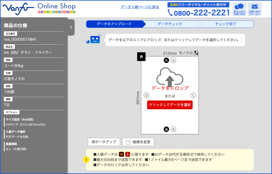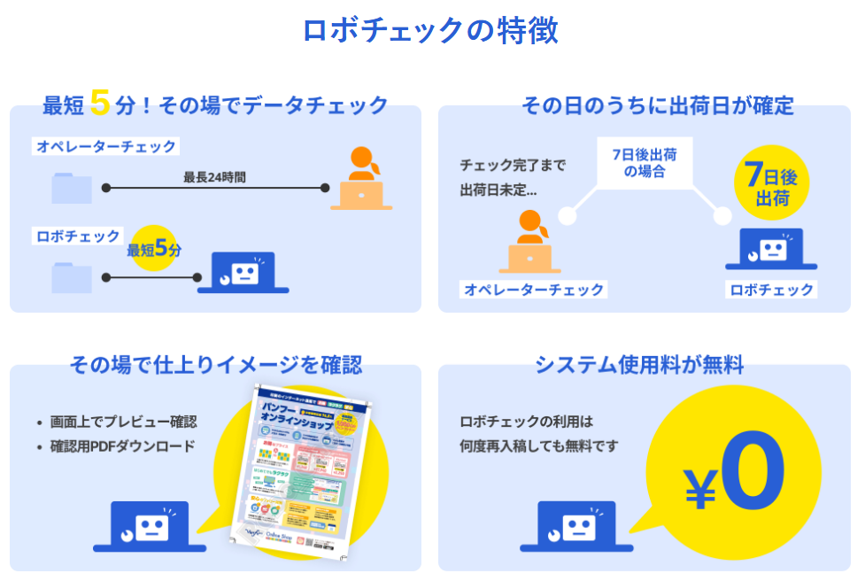 従来のオペレーターによるデータチェックに加えて、自動データチェック「ロボチェック」を導入しました。これまで最大24時間のチェック時間を必要としていましたが、ロボチェックでは最短5分程度でチェック完了できます。大幅に時間短縮につながり、より便利にお使いいただけます。 ※詳細についてはこちらをご参照ください