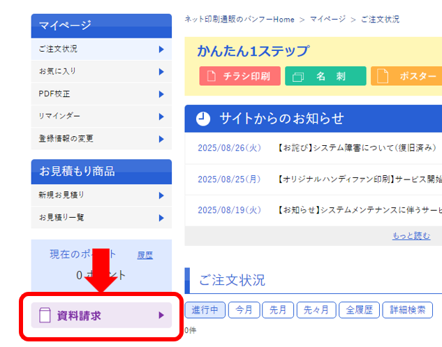 会員登録 をしていただくと、マイページより資料請求が可能になります。 マイページ左側メニューの「資料請求」より、お申し込みください。 ※詳細についてはこちらをご参照ください※資料請求は無料です。恐れ入りますが、お届けまでに1週間程かかります。