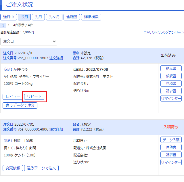 会員のお客様は、過去履歴からかんたんにリピート注文が可能です。