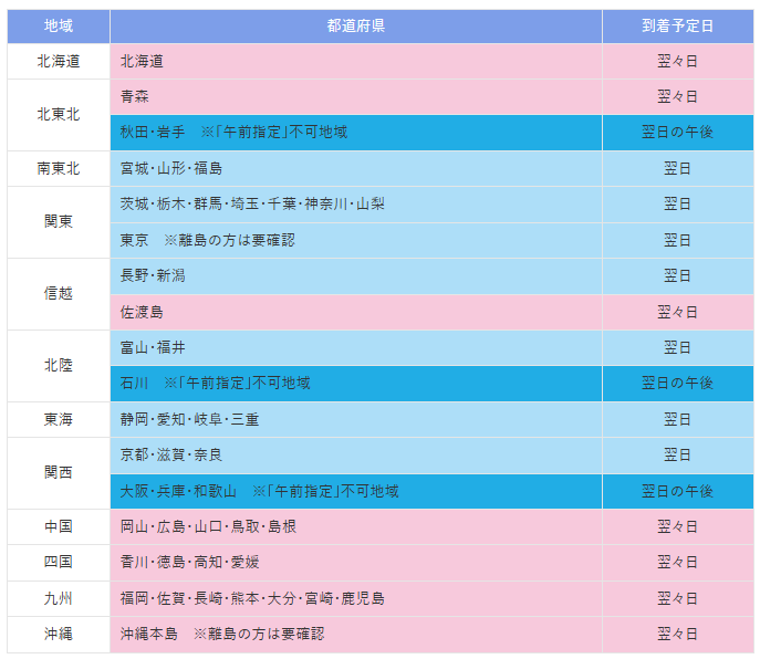 商品は「東京」から発送いたします。(一部商品を除く)発送から到着までのお日にちは、下の表よりご確認ください。