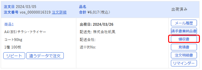 領収書は、出荷完了後にマイページからダウンロード可能です。
