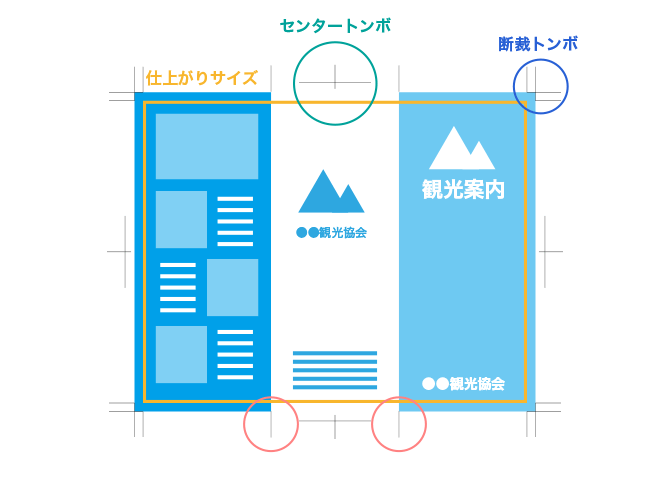センタートンボ、断裁トンボ(コーナートンボ)の他、下図赤丸の折トンボがあります。