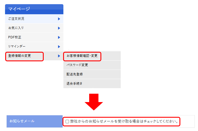 メルマガの配信停止をご希望の場合は、マイページ >「登録情報の変更」>「お客様情報確認・変更」より お知らせメール のチェックを外して更新をしてください。